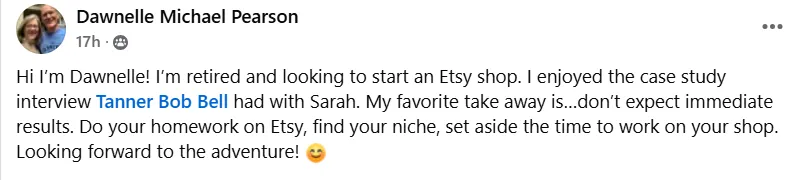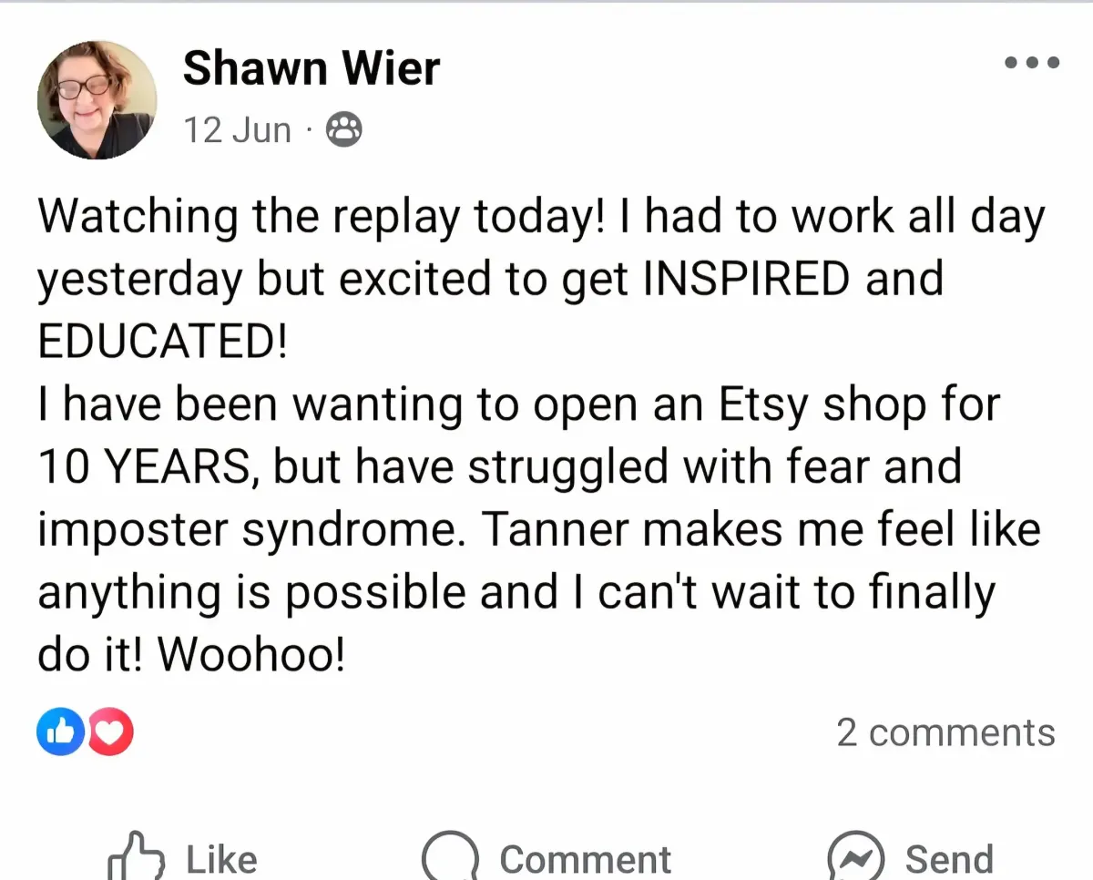 "I've been wanting to open an Etsy shop for 10 YEARS, but have struggled with fear and imposter syndrome. Tanner makes me feel like anything is possible and I can't wait to finally do it! Wohoo!"
